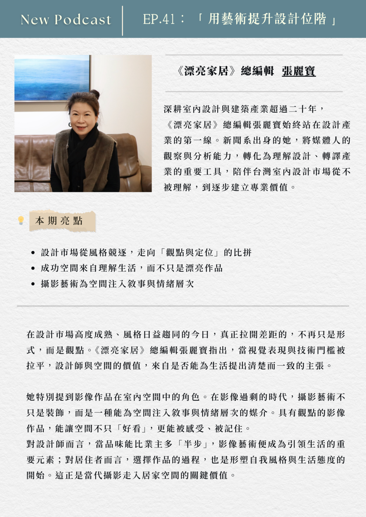 專訪 EP. 41|用藝術提升設計位階 – 漂亮家居總編輯 張麗寶
